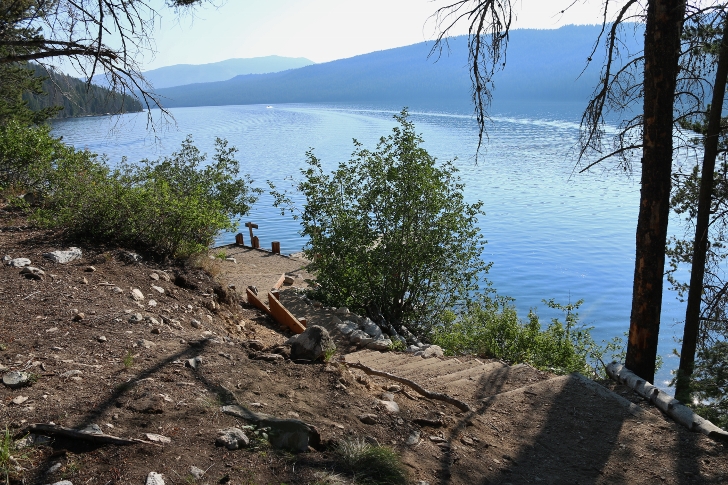 I did this 8 mile round trip hike as a day hike and it worked out well however it would be a great backpack destination as well. From Stanley, Idaho you travel south on Hwy 75 towards Sun Valley. In about 6 miles you will turn right onto the Redfish Lake Rd and continue on to the trailhead near Redfish Lake Lodge. I have included a Google Map to show you the way. I parked in the trailhead(trail 186) parking lot and walked to the docks at Redfish Lake Lodge. I did not follow trail 186. In the picture below the shuttle departed from the left most dock. It cost me $10 (in 2014) to get a ride from here to the dock at Redfish Inlet Trailhead/Campground. See the pictures below.