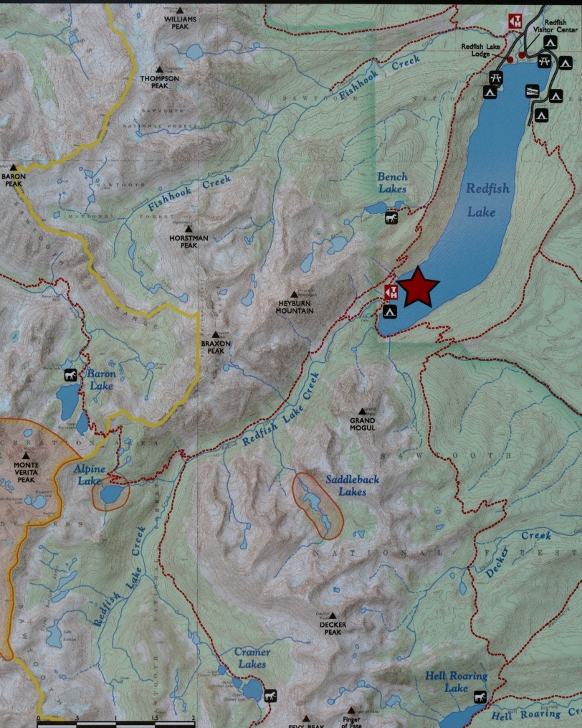 I rode this shuttle boat from Redfish Lodge. There were two couples on the shuttle with me. One couple headed up Redfish Creek to the Saddleback Lakes(another place I want to go) while the other lead the way on the route I was taking. I mention them because he was 81 and she was 80 years old. They have been hiking the Sawtooths and other Idaho mountains for many decades. I find this to be quite inspiring.
