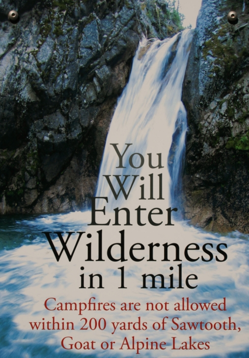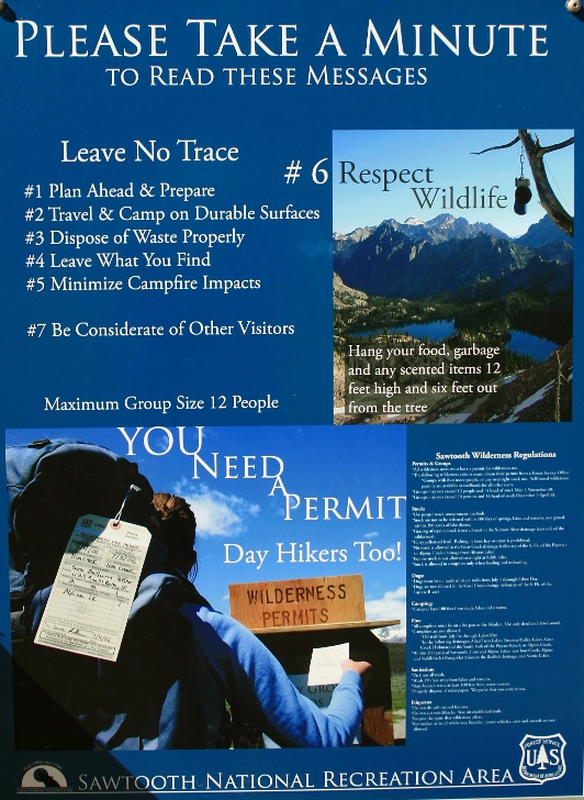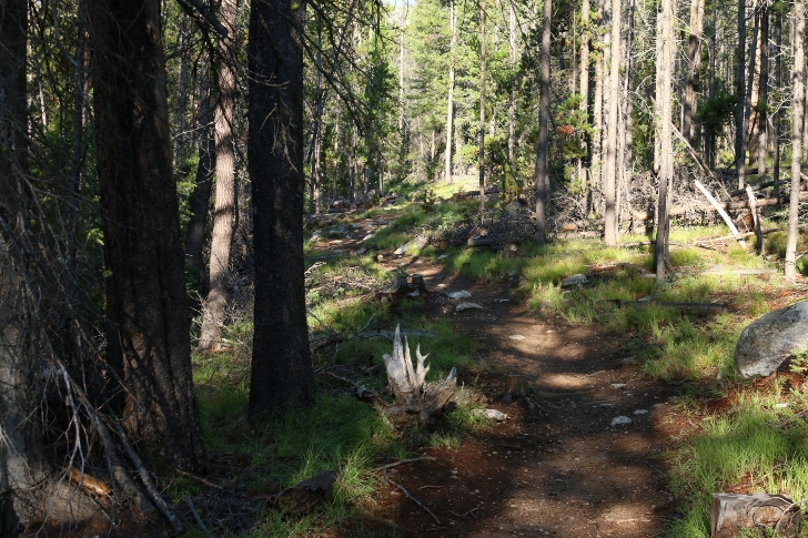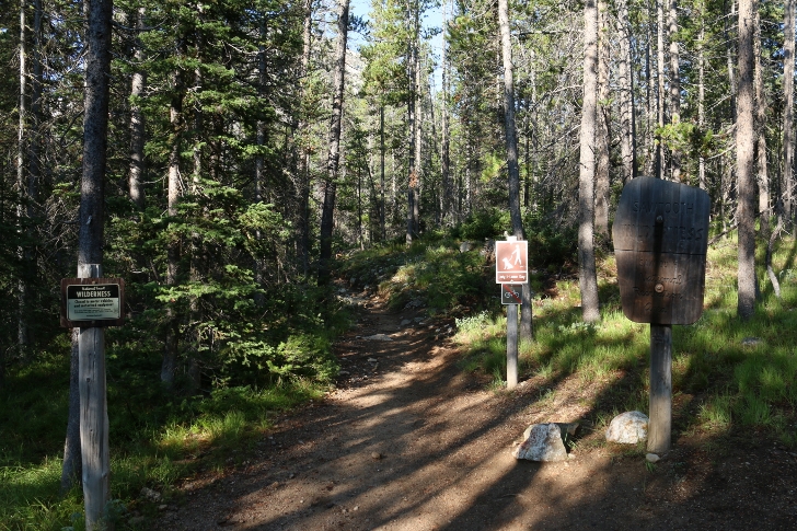 As I stated on my Goat Lake hike review I did not get pictures of the trailhead itself however these are pictures of the signs at the Iron Creek Trailhead. For a Google Map of the road to Iron Creek Trailhead from Stanley, ID checkout this link. I arrived at approximately 7:20am on August 15, 2014 and the first rays of sunlight had managed to reach over the treetops to shine weakly on these signs. About halfway down this map on the righthand side you will see a bright red star marking your current location. Following the trail of red dashes marking the trail as it proceeds west southwest from the trailhead you reach the boundary of the wilderness area in 3/4 of a mile. Don't forget to get your wilderness permit before leaving the trailhead. At 1 mile the trail to Goat Lake forks off sharply to the left. See the pictures below.